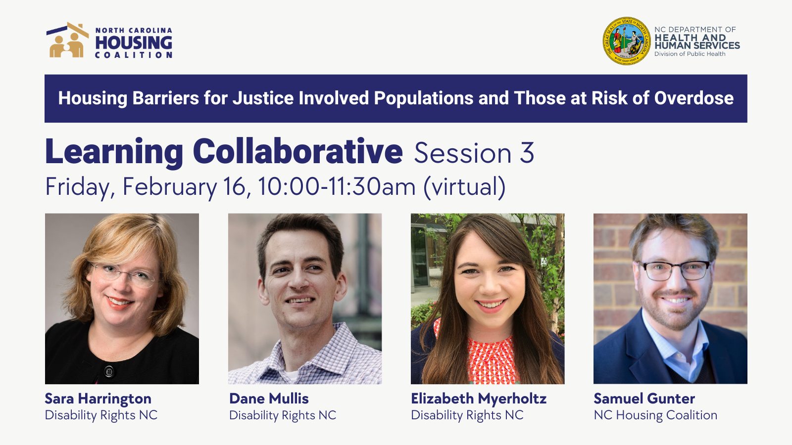 The NC Housing Coalition is hosting a Learning Collaborative featuring Disability Rights NC! We’ll be discussing Substance Use Disorders and Disability Rights Laws: Eliminating Barriers to Healthcare and Housing.