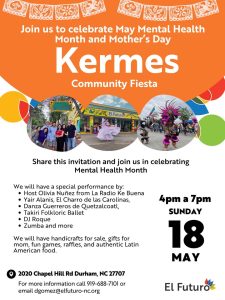 All Events More News Kermes Kermes Event Date & Time May 18, 20254:00 PM - 7:00 PM Sunday This event has passed. DATE: May 18, 2025TIME: 4:00 PM Come join us celebrate May Mental Health Month and Mothers’s Day! Download Flyer Add to calendar Google Calendar iCalendar Outlook 365 Outlook Live Venue Kermes 2030 Chapel Hill Rd Durham, NC 27707 PrevPreviousZCamp Health & Resource Fair NextCommunity Resource FestivalNext Share
